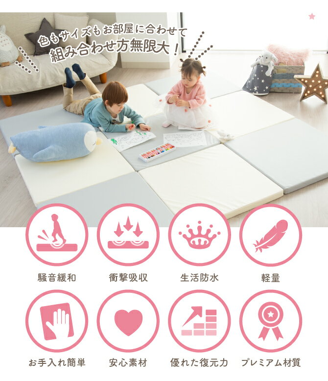 極厚4cmのクッションが衝撃からお子さまをしっかりと守り、 赤ちゃんの安全に遊べるスペースや寝返りマットとして、元気なお子さまがいるご家庭のプレイマットとして大活躍! また、お子さまがお家の中で元気いっぱいに遊んだ時の気になる騒音もしっかり吸収します。